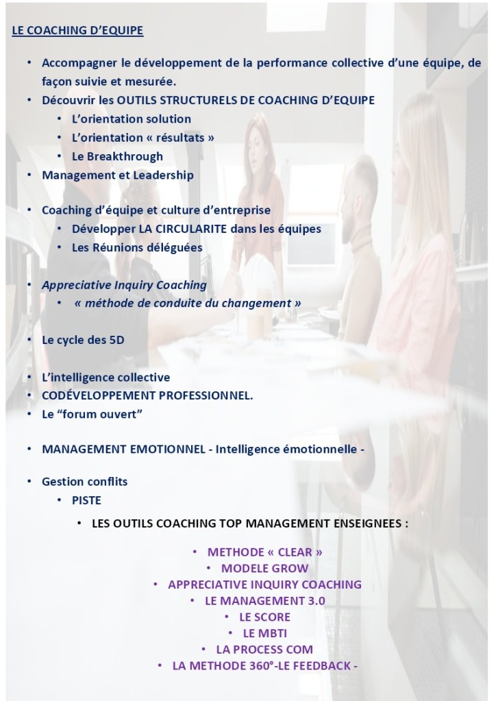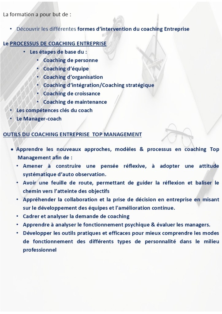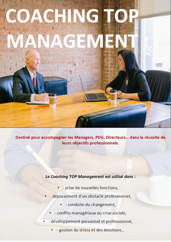 - Apprendre les outils et les Techniques du Coaching Top Management destinés spécialement à accompagner les PDG, Managers…