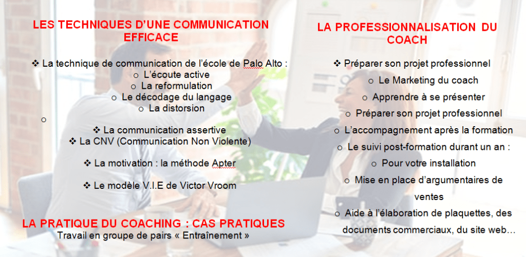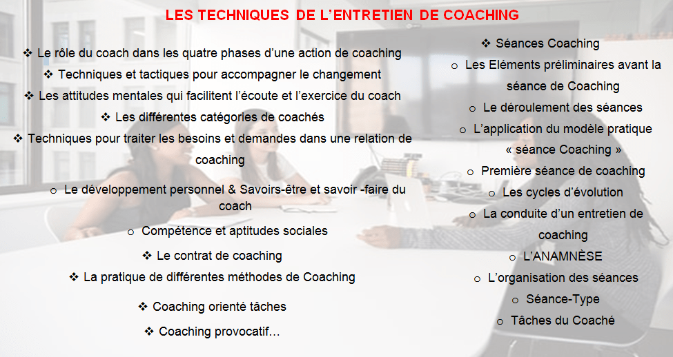 - Maîtriser les différentes techniques de Coaching Professionnel et les règles de conduite facilitant la réalisation d’une intervention d’accompagnement.